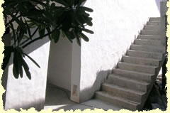 The courtyard garden is made up of small lawns and sweet-smelling, white-flowered temple trees, and red and white bougainvillea, which enhance the peacefulness. The guest rooms are located at the sides of the courtyard, under an earthen tiled roof supported by a white colonnade that runs the full length of each side. Old Lanna boxes and trunks are placed under the colonnades for decoration.